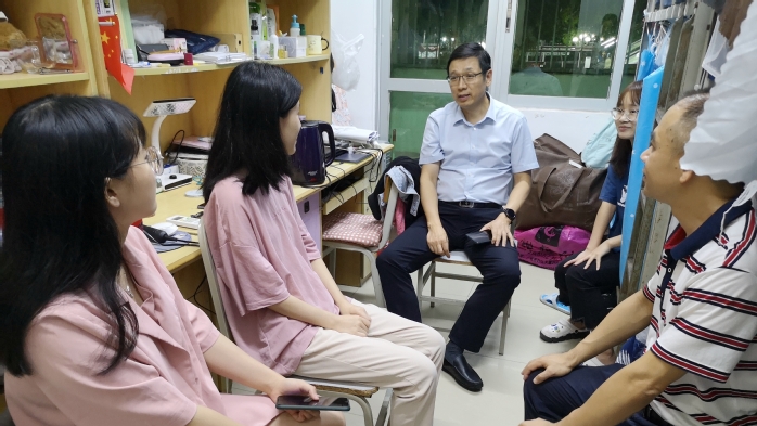 本网讯 9月28日晚,副校长郑文前往挂钩学生宿舍旭日广东服装学院19级工程1班女生宿舍看望同学们,并给同学们送去了月饼及中秋祝福。
