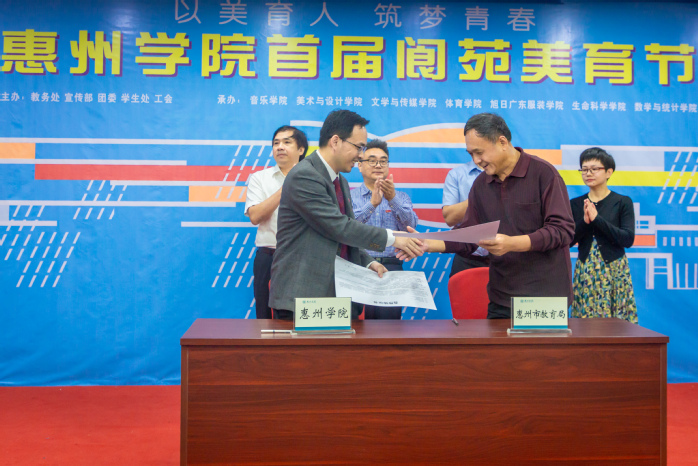 我校教务处处长陈益智与惠州市教育局三级调研员秦昌俊就支持“惠州市美育联盟”工作签定了《合作协议》。罗川山、刘国栋,罗昆、刘苗上台共同见证签约仪式。罗川山、刘国栋、罗昆、秦昌俊等为“惠州市美育联盟”揭牌。罗川山为“惠州市美育联盟”成员单位代表(惠州市城市职业学院、惠州市体育运动学校、惠州市实验中学)颁发证书。