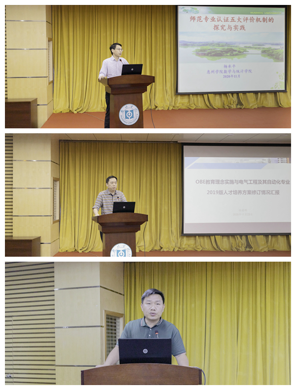 我校已通过认证的三个专业核心成员作经验交流分享汇报。数学与统计学院副院长杨水平分享了数学与应用数学专业以师范认证专业为契机,建立健全师范专业认证五大评价机制并进行了有效实施。电子信息与电气工程学院电气工程系主任徐德明汇报了基于OBE教育理念实施的电气工程及其自动化专业2019版人才培养方案修订情况。建筑与土木工程学院土木工程系主任娄永忠分享了将工程教育认证理念有机融入土木工程专业人才培养方案修订的经验体会。