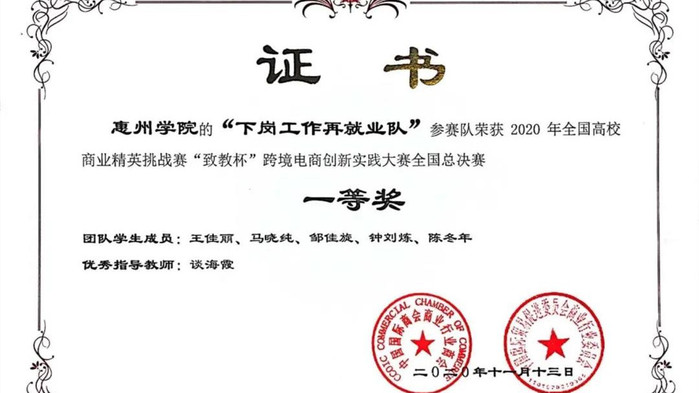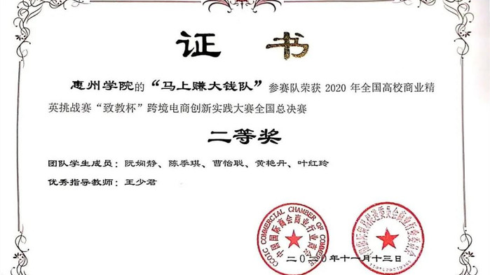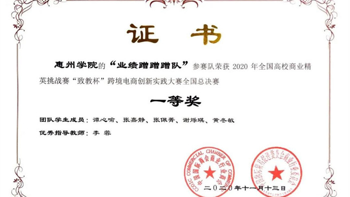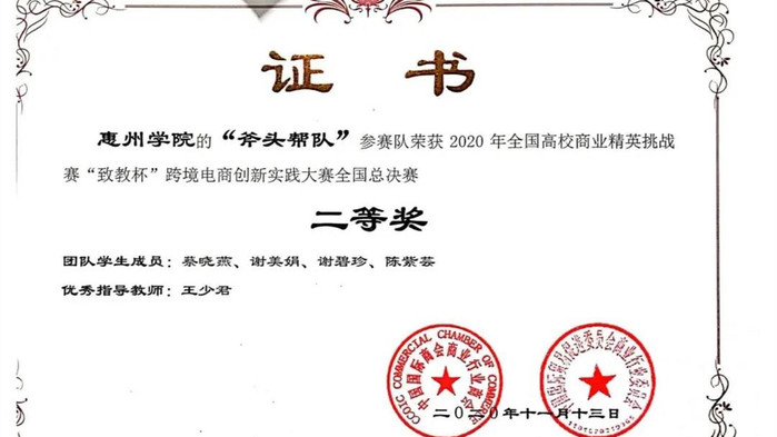本网讯 11月13日,2020年全国高校商业精英挑战赛第四届“致教杯”跨境电商创新实践大赛落下帷幕。经过紧张激烈的决赛角逐,我校共有四支队伍脱颖而出。其中,由李蓉老师指导,谭心喻、张嘉静等队员组成的“业绩蹭蹭蹭队”和由谈海霞老师指导,王佳丽、马晓纯等队员组成的“下岗工作再就业队”两支队伍获得全国一等奖。由王少君老师指导,蔡晓燕、谢美娟等组成的“斧头帮队”和阮娴静、陈季琪等组成的“马上赚大钱队”两支队伍获全国二等奖。