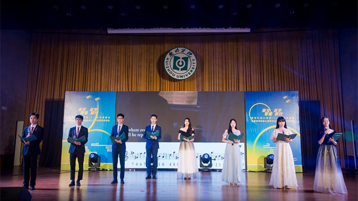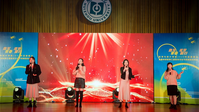 随着充满青春活力的健美操节拍,迎新晚会拉开序幕。晚会由数写青春、唱响未来、逐梦前行三个篇章组成。古典舞、歌曲串烧、小品等节目依次精彩上演。第一篇章的歌曲《太阳》等歌舞表演旋律优美、激情豪迈、光影闪烁,青春的气息感染了台下的师生。由杨莹等四位老师演唱的《不忘初心》把晚会推向高潮,台上老师倾情演唱,台下同学积极互动和歌,现场气氛热烈。“地球上最长的蛇不过四十英尺,神话和传说中的蛇也无分轩轾。组成π的数字列队行进逶迤……越过墙壁、树叶、鸟巢、云霓直上九霄,穿过广袤无垠的天际”同学们抑扬顿挫、声情并茂地朗诵了波兰女诗人、诺贝尔文学奖获得者维斯瓦娃·辛波丝卡致敬圆周率π的作品,仿佛诉说着数学人的坚韧不拔。晚会第三篇章在《了不起的π》的朗诵中落下帷幕。