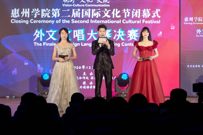 本网讯 12月21日晚,由党委宣传部、国际合作交流处、校团委、学生处、教务处、工会主办,外国语学院承办的学校第二届国际文化节闭幕式暨外文歌唱大赛决赛在鹅城会议厅举行。副校长刘国栋,国际交流合作处、学生处、团委、教务处、工会、外国语学院负责人以及各二级学院师生参加活动。