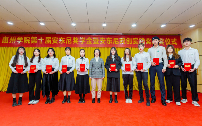 本网讯 12月16日下午,学校第三十一届旭日奖学金颁奖仪式、第十届安东尼奖学金暨安东尼双创实践奖颁奖仪式在图书馆学术报告厅举行。旭日企业(惠州)行政管理办公室助理总监单陈,佛山安东尼针织有限公司副总裁、总经理蔡淑琼,我校党委学工部、旭日广东服装学院领导与教师代表,企业代表、全体获奖者、学生代表等近250人参加了颁奖仪式。颁奖仪式由旭日广东服装学院马佩英老师主持。