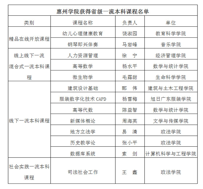 据悉,全省共651门课程被认定为2020年度省一流本科课程,其中,精品在线开放课程78门,线下一流本科课程330门,线上线下混合式一流本科课程206门,社会实践一流本科课程37门。根据《广东省教育厅关于公布首批省级系列在线开放课程立项课程验收结果的通知》(粤教高函[2020]10号)文件,我校饶淑园教授的《幼儿心理健康教育》课程通过了广东省教育厅首批省级系列在线开放课程结题验收,被直接认定为省级精品在线开放课程。至此,我校共有13门课程获得省级一流本科课程的称号。