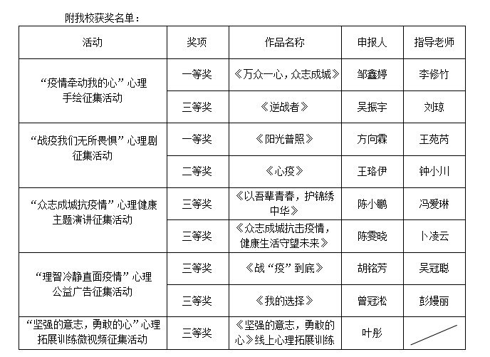 我校师生踊跃参赛,活动作品充分展现了疫情防控期间师生积极向上的精神风貌。最终,我校选送的作品在本次心理健康教育系列活动中所有项目均有获奖,获奖数量较往年稳中有升。