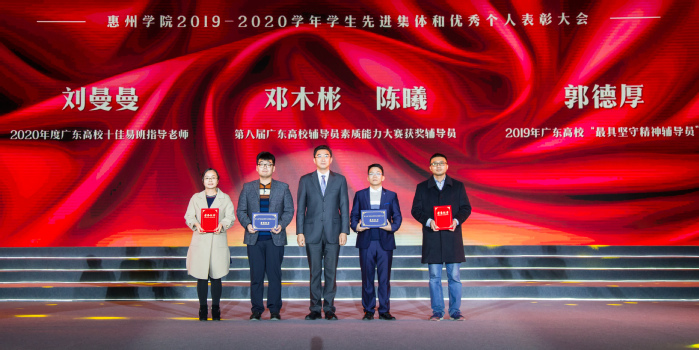 彭永宏为广东高校十佳易班指导老师刘曼曼、第八届广东高校辅导员素质能力大赛获奖辅导员邓木彬、陈曦以及广东高校“最具坚守精神辅导员”郭德厚颁奖。具有12年辅导员工作经历的郭德厚老师分享了自己扎根辅导员岗位的三点体会:一是要对教育心怀敬畏;二是要脚踏实地;三是要进行价值引导。学生代表深情演唱《辅导员之歌》向兢兢业业的辅导员团队致谢。