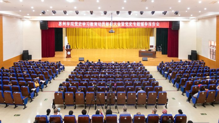 本网讯 3月10日下午,我校党史学习教育动员部署大会暨党史专题辅导报告会在鹅城会议厅召开。校党委书记、校长彭永宏,党委副书记、纪委书记、省监委驻惠州学院监察专员罗川山,副校长刘国栋,各职能部处负责人,各二级学院院长、党总支书记、党总支副书记、党支部书记、组织员,学校党委理论宣讲团成员,马克思主义学院全体教师,全体辅导员和师生党员代表参加会议。会议由罗川山主持。