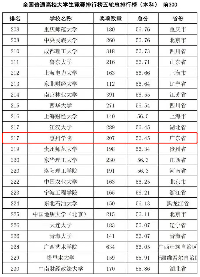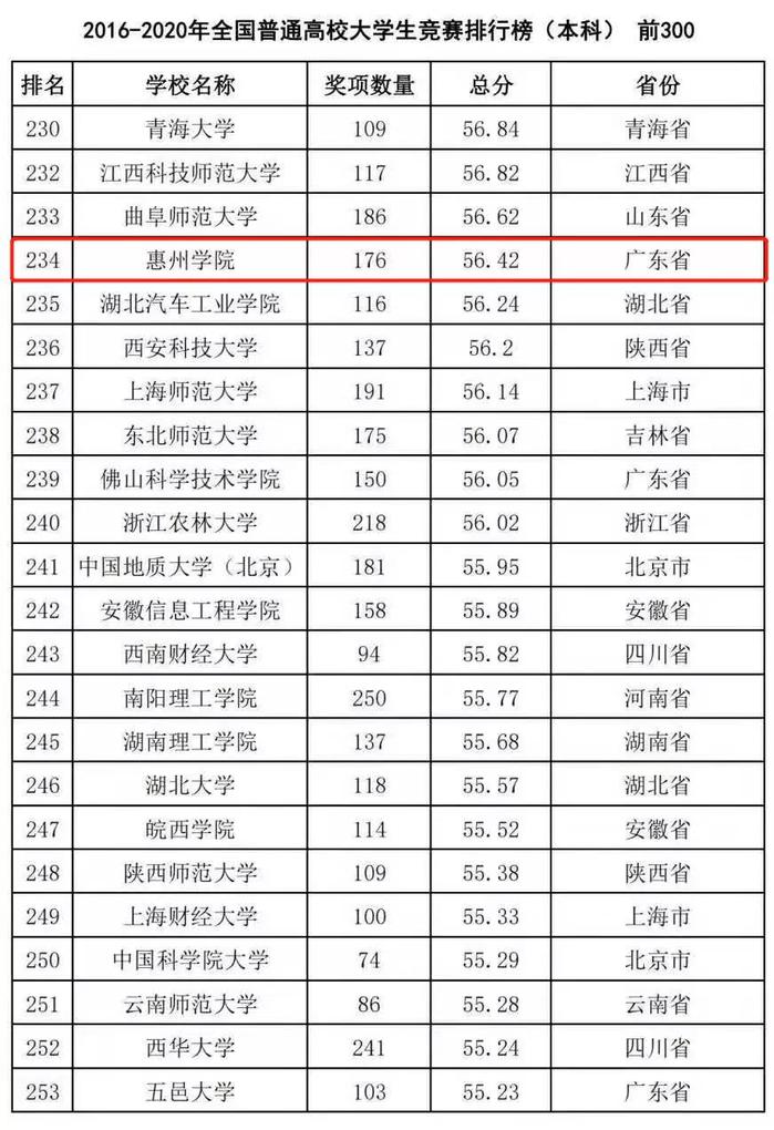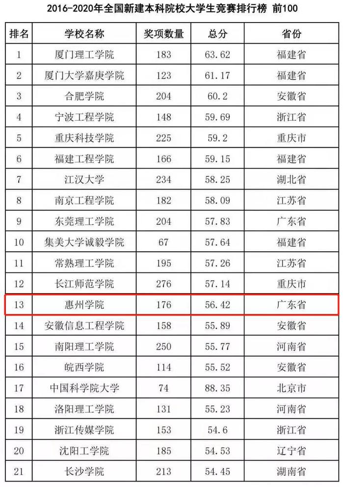 3月22日,中国高等教育学会高校竞赛评估与管理体系研究工作组发布2020年全国普通高校大学生竞赛排行榜,其中在发布的《全国大学生竞赛排行榜五轮总排行榜(本科)前300》(时间跨度从2012年到2020年)榜单中,我校位于全国高校217位;在《2016—2020年全国普通高校大学生竞赛排行榜(本科)前300》榜单中,位列第234位;在《全国新建本科院校大学生竞赛排行榜前100》榜单中,位列全国第13位,位列广东省第二。