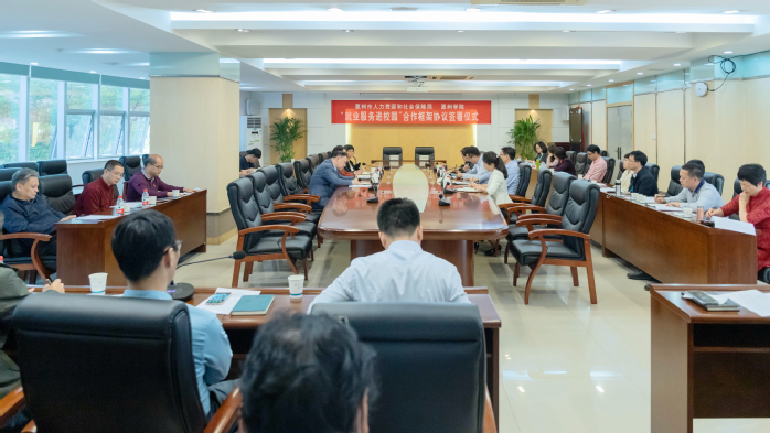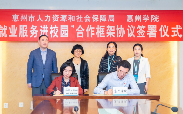 本网讯 3月25日,惠州市人力资源资源和社会保障局与我校签署“就业服务进校园”合作框架协议。惠州市人力资源和社会保障局(以下简称“市人社局”)党组书记、局长张伟荣,党组成员、副局长范卫萍,市人才交流服务中心主任魏敏,我校党委书记、校长彭永宏,副校长郑文,人事处处长赖平,学生处处长胡萍及各二级学院党总支书记参加了本次签约仪式并进行座谈,仪式由郑文主持。