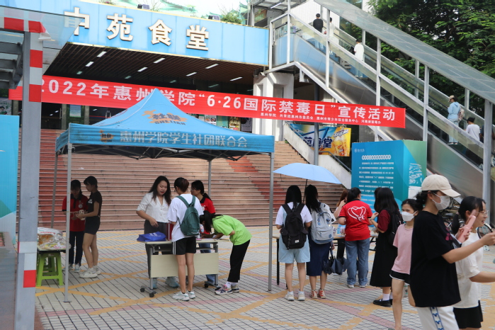 本网讯 2022年6月26日是第35个“国际禁毒日”,我校联合共青团惠州市委员会、惠州市青少年综合服务中心、河南岸禁毒办于学校中苑生活区举办“健康人生、绿色无毒”禁毒宣传主题活动。