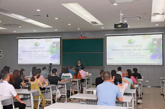 据悉,此次培训班由广东省教育厅指导、惠州学院与惠州市教育局联合主办,遴选龙门县、博罗县、惠东县35名一线美育(音乐、美术)教师参加。培训班为期五天,以主题报告、案例教学、现场考察、互动体验等形式,围绕美育课程教学改革研究、美育工作管理政策法规与发展理念研究、美育教育管理前沿理论研究、美育专业素养提升等内容,采取线下和线上相结合形式进行,邀请到国内包括首都师范大学、苏州大学、深圳市教育研究院等多位知名美育专家,校内外美育骨干教师、教研员、非遗文化传承人进行授课。为实现“双进双培”职前职后教师一体化发展,我校师范专业学生也参加了本次培训活动,同时本次线上讲座也对外全程直播,进一步扩大了美育浸润服务的受益面和辐射面。