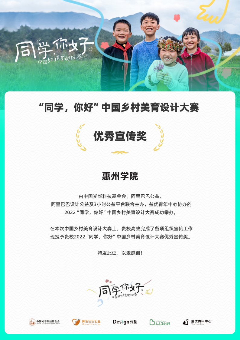 本网讯 近日,“同学你好”中国乡村美育设计大赛结果公布,我校荣获优秀宣传奖1项,美术与设计学院团总支书记赖成业获“优秀指导老师”和“优秀执行专员”称号。
