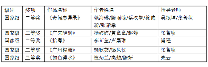 本网讯 近日,经校级、省级层层选拔,美术与设计学院师生在2022年(第15届)中国大学生计算机设计大赛全国总决赛获全国二等奖3项、三等奖2项的历年最好成绩。获奖作品《奇闻志异录》《广东醒狮》《拾粤》《广州榄雕》《如鱼得水》五件作品均以岭南文化为主题创作,涵盖了游戏设计、动画设计、信息图表设计、家具设计领域,表现了我校师生对本土文化的深厚情怀和出色的专业技巧。