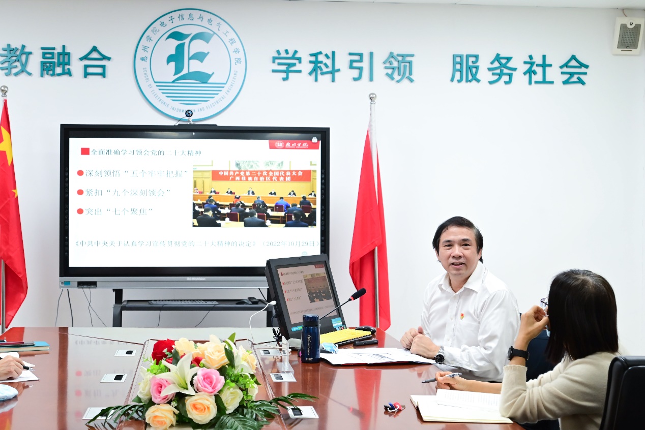 本网讯 为深入学习贯彻党的二十大精神,11月23日,电子信息与电气工程学院在电子楼205会议室召开学习贯彻党的二十大精神宣讲会,学校党委理论宣讲团成员、副校长刘国栋作主题宣讲,全体教职工、学生代表参会。会议由学院党总支书记谭润志主持。