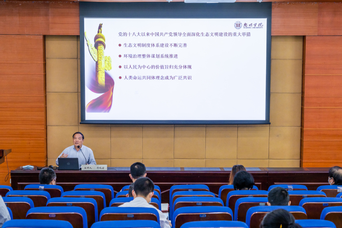 会上,副校长许玩宏作《人与自然和谐共生是中国式现代化本质要求——学习宣传贯彻党的二十大精神》专题领学,从我们的祖国天更蓝、山更绿、水更清——新时代十年我国生态环境保护的成就、“中国式现代化是人与自然和谐共生的现代化”内涵解读以及争做生态文明建设贡献者三个方面进行了详细阐述。他指出,作为高校,要以党的二十大精神为指引,落实立德树人根本任务,积极加强生态文明教育,探索将生态文明教育有机融入课堂教学与实践教学全过程的有效路径,并通过绿色校园创建系列工作,加强生态文明教育、施行绿色规划管理、建设绿色环保校园、培育绿色校园文化、推动绿色创新研究,不断提升师生生态文明素养,强化环保养成教育,厚植绿色发展理念,建设绿色生态校园。