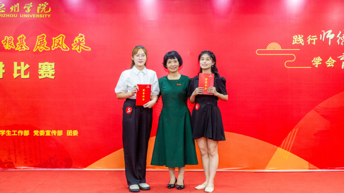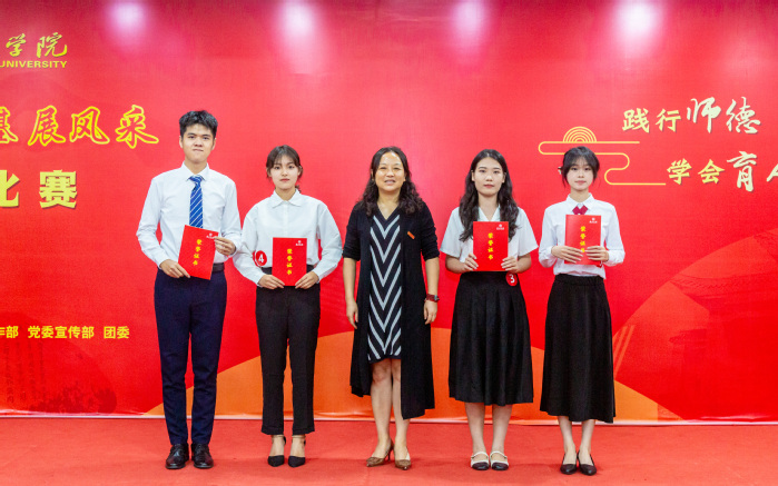 经评委小组现场评分,教育科学学院郑曼里、外国语学院林桂丽荣获特等奖,地理与旅游学院翟志康、文学与传媒学院王佳欢、体育学院刘帆、政法学院陈可谚获一等奖,数学与统计学院钟莉、生命科学学院贺宇坚、马克思主义学院谢嘉仪、美术与设计学院张瀚少、化学与材料工程学院陈镇珊、音乐学院张钰琪、电子信息与电气工程学院汪佳琪获二等奖。