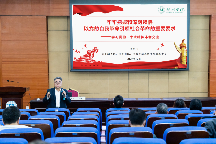 会上,校党委副书记、纪委书记、省监委驻惠州学院监察专员罗川山作《牢牢把握和深刻领悟以党的自我革命引领社会革命的重要要求》学习贯彻党的二十大精神专题领学,从党的自我革命概念提出、党的自我革命伟大实践、全面把握和深刻领会以伟大自我革命引领伟大社会革命的重要要求三个方面进行了具体阐述。他指出,马克思主义政党的鲜明特征是革命性,勇于自我革命是马克思主义政党永葆先进性纯洁性的必然要求。面对伟大斗争的复杂性,必须发扬党的自我革命精神,将党的自我革命进行到底;在以中国式现代化全面推进中华民族伟大复兴的新征程,必须深入推进全面从严治党不动摇,全面落实新时代党建总要求;踏上实现第二个百年奋斗目标新的赶考之路,必须始终坚持“三个务必”,必须始终保持“赶考”的清醒和坚定,以彻底的自我革命精神,以永远在路上的执着,把党的伟大自我革命进行到底,在新时代新征程上赢得更加伟大的胜利和荣光。