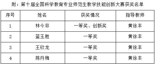 本网讯 近日,由中国青少年科技教育工作者协会主办,岭南师范学院和中国青少年科技教育工作者协会科学教师教育专业委员会共同承办的“第十届全国科学教育专业师范生教学技能创新大赛(本科赛道)”圆满落幕。我校2020级生物科学专业林今非、蓝玉胜、王钦龙、陈丹梅4名同学入围决赛,并获4项一等奖和1项创新奖(全国仅4项),广东省4个一等奖获得者全部来自我校。