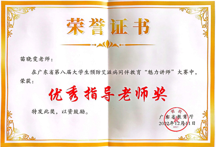第八届大学生预防艾滋病同伴教育“魅力讲师”大赛由广东省教育厅主办,华南农业大学承办,全省高校推选两百多名大学生参赛。我校高度重视参赛组织,自2022年4月便在校内进行宣传、推广及校内预选赛,经过层层筛选和激烈角逐,2020级英语2班丘思娴以校赛第一名的成绩挺进省赛。在赛前准备阶段,丘思娴同学选取“性病-梅毒”科普为授课内容,从名人故事出发,结合科学调查数据,对梅毒的传播途径及预防方法进行了细致讲解,其幽默风趣又富含深意的授课风格获得省赛评委的一致好评。
