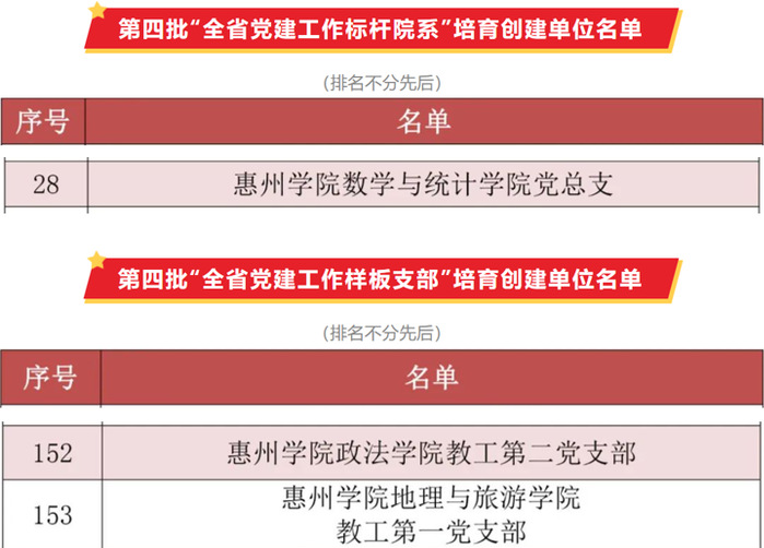 本网讯 近日,中共广东省委教育工委公布第四批广东省新时代高校党建示范创建和质量创优工作培育创建单位名单。我校数学与统计学院党总支获批“全省党建工作标杆院系”培育创建单位,政法学院教工第二党支部、地理与旅游学院教工第一党支部分别获批“全省党建工作样板支部”培育创建单位。目前,学校已获批“全国党建工作样板支部”2个,“全省党建标杆院系”2个,“全省党建工作样板支部”6个,学校基层党建工作质量持续提升。