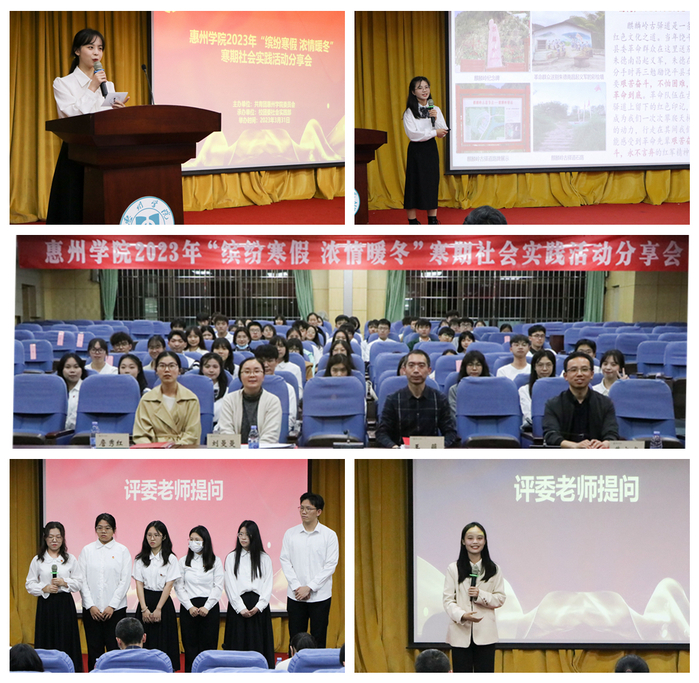 分享会上,各二级学院的15支队伍依次分享展示了本团队的寒期社会实践成果。来自政法学院的红色信使团队,以“追寻红色‘潮'文化,学习党的二十大精神”为主题,在潮州开展了为期7天的寒期社会实践活动,并通过宣讲、网络宣传等方式传递党的二十大精神,推动红色文化传承传播。生命科学学院个人代表曾荧荧,将温暖爱心付诸于实践,在人潮涌动的车站里身穿“红马甲”,帮助老年人取票、协助乘客刷脸认证、在候车大厅里指引候车,一件件听起来似乎再平凡不过的寻常小事,却为寒冬增添了一抹温暖的色彩。寻味家乡传统年俗、追寻红色记忆、分享展示大学校园、参与志愿关爱服务活动……一位又一位惠院学子在寒假生活中身体力行,以自己的亲身实践书写着青年学生的使命与担当。