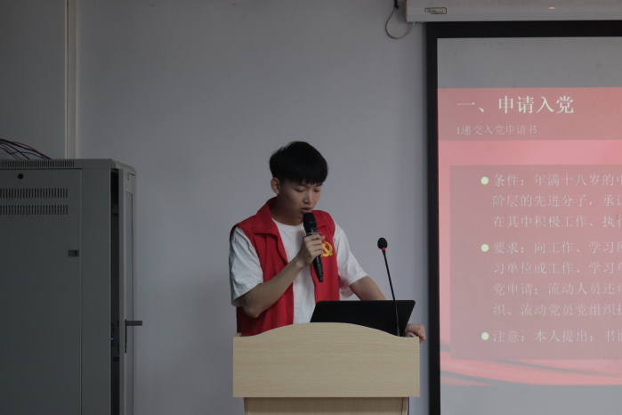 会上,宋海辉同学领学了《中国共产党章程》总纲和第一章内容,引导同学们对党的性质、根本宗旨、基本纲领、基本路线有了更进一步的理解和认知,对什么是党员、入党流程、党员权利和义务进行了讲解。随后,他就如何撰写一份合格的入党申请书做了详细的分享。他鼓励同学们胸怀大志,认真学习党的基本知识,以实际行动积极向党组织靠拢。