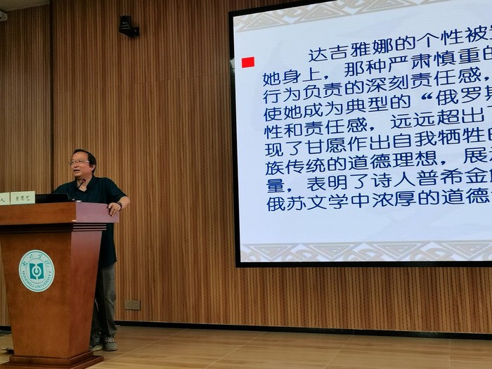 曾思艺教授作“个性 自由 责任——《叶甫盖尼·奥涅金》解读”主题讲座。他认为,《叶甫盖尼·奥涅金》深刻地思考了人类社会的一个普遍问题——个人与社会的关系问题。自由就是选择,是个体自身在社会环境中对自己的选择。坚持个性,也就意味着自由选择。个性和自由(选择)必须以责任为前提。他强调,达到个人与社会和谐的途径是:个人在维护个性、追求自由、作出选择时,必须意识到自己对他人的责任,妥善处理为我与为他的关系。奥涅金的个性既立足于现实,又远离真正的生活——自然和人民;既想有所作为,又由于缺乏决心和毅力,难以振作起来;既有为社会、为他人服务的思想,又保留着颇为自私、贪图安逸的个人主义特性;既有较善良、高尚的情怀,又有虚荣、利己的特征。普希金在《叶甫盖尼·奥涅金》中对个性与自由的问题,进行了更全面、更深刻的哲学反思。
