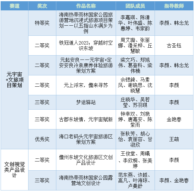 本次竞赛由中国旅游协会旅游教育分会和海南大学、海南省旅游投资发展有限公司联合举办,大赛分“元宇宙+文旅项目策划”和“文创视觉类产品设计”两个赛道。大赛吸引了全国242所院校(含澳门高校)的566支队伍报名参赛,由组委会组织评审专家针对两大主题类作品分别进行评审。我校旅游管理专业学生经过3个多月的精心准备,取得了较好的成绩。通过参加这次比赛,同学们实现了学做结合,并对元宇宙及其在旅游项目设计中的应用有了新的认识与收获,增强了学好旅游管理专业、将新技术与旅游产品设计相结合的信心与决心。