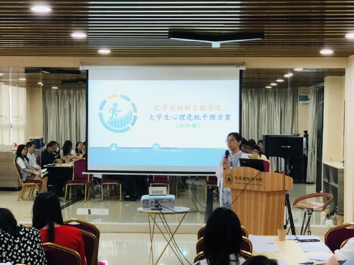 会上,化学与材料工程学院党总支副书记张莉琼对《化学与材料工程学院大学生心理危机干预方案(讨论稿)》(下称《方案》)进行了简要讲解,《方案》从指导思想、组织架构、预防教育、早期预警、干预对象、危机干预、后期跟踪、工作制度、其他等九个方面探讨了如何更好地防止心理危机事件的发生与更及时高效地处理危机事件,并分享了化学与材料工程学院在“全员育人,构建心理健康教育工作队伍新模式”中的经验做法。