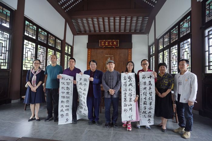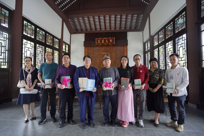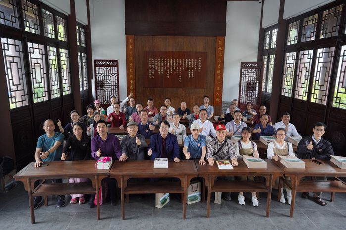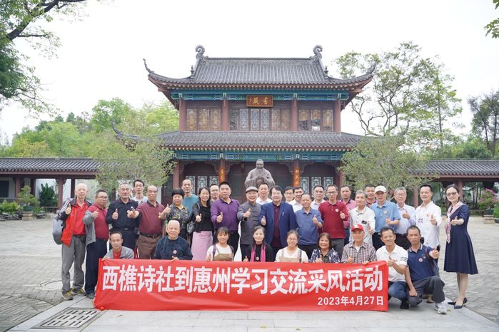 本网讯 4月27日,佛山西樵诗社社长吴燕群一行30人来惠州采风,并专程拜会东江文化研究院院长关建人先生。在丰湖书院乐群堂,关建人先生和惠州市诗词楹联学会会长罗胜前、常务副会长王蔚,我校东江文化研究院东坡文化研究中心主任申东城等一同欢迎会见西樵的诗人们。