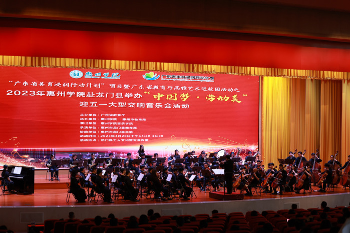 本网讯 4月28日下午,“广东省美育浸润行动计划”项目暨广东省教育厅高雅艺术进校园之“中国梦·劳动美”迎五一大型交响音乐会在龙门县工人文化宫举办。龙门县副县长周少亭、惠州市教育局副局长杨炎林、龙门县教育局局长萧波勇,我校党委宣传部、教务处、学生处、教师发展中心、音乐学院、教育科学学院等相关负责人出席音乐会。