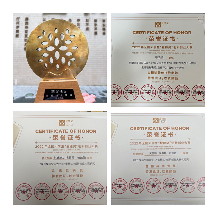本网讯 4月24日,2022年全国大学生金穗奖创新创业大赛颁奖盛典在广州中大门国际时尚发布中心举行。500余名来自高校、行业协会、知名广告公司、企业品牌与地方乡镇代表齐聚现场。我校“久闻茶香,走近柏塘”团队(团队成员:英语专业2021级2班 林琪琪、沈若西、曾灿浩)获大赛铜奖,“山茶沁人心,柏塘闻其香”团队(团队成员:英语专业2021级4班 黄美婷、侯嘉颖)获大赛优秀奖,外国语学院邹凤媚老师获最佳指导老师奖,学校获最佳院校组织奖。