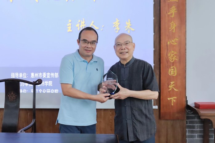 关建人先生为李朱先生颁发“丰湖讲堂主讲嘉宾留念”水晶台