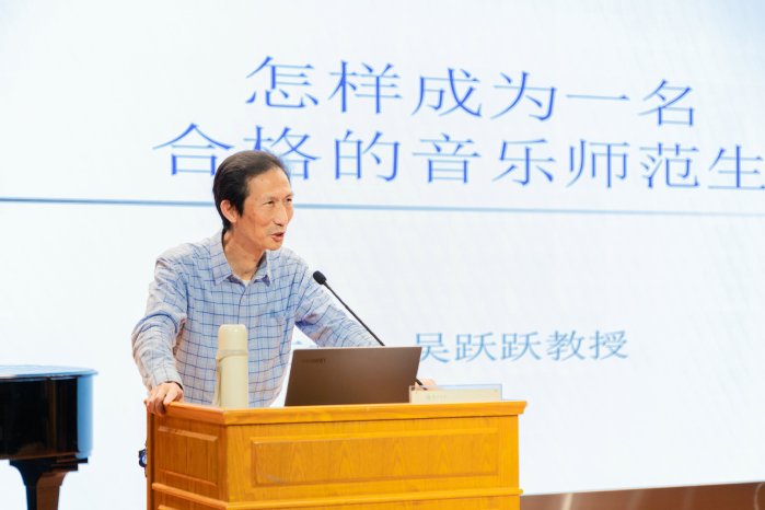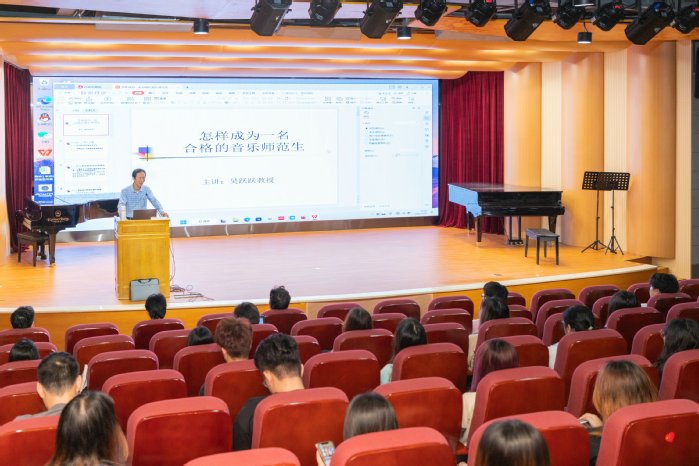 讲座伊始,吴跃跃教授向在座师生提出两个问题——“什么是合格的音乐师范生”和“怎样成为一名合格的音乐师范生”,同学们积极发言互动。吴跃跃教授指出,合格的师范生应该满足两个条件,一是完成了人才培养方案中的学习任务,达到了毕业规定的要求;二是具备音乐教师的基本素质。他鼓励大家制定切实可行的四年学习规划,树立人生的奋斗目标,重视音乐师范生特色课程的学习,培养自己的团队协作能力、音乐情感感知能力等,在音乐实践中要认真观察,积极思考,善于发现问题并勇于创新。
