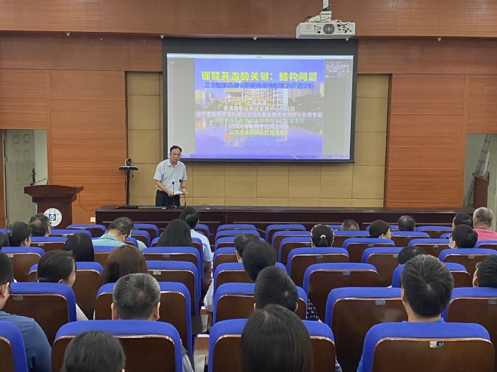 本网讯 为深化课程体系改革,帮助教师更好开展课程设计,推动教师教学创新。近日,教师发展中心、教务处在文城会议厅联合组织开展《课程开发的关键:结构问题——工作过程系统化课程开发》讲座,特邀教育部职业教育发展中心研究员姜大源教授作线上主题分享。校级教学督导委员、一流课程负责人及团队成员、各产业学院专任教师与其他感兴趣的教师共130余人参加,讲座由教师发展中心主任肖向明主持。