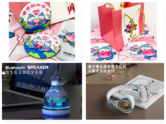 前期,我校美术与设计学院师生已经就“墩头蓝”非遗项目开展了多个项目研究,对“墩头蓝”文化进行传播推广及应用。如与河源市中心血站进行“河源市中心血站IP形象设计”横向项目合作,其IP形象设计采用了“墩头蓝”非遗项目元素。在交流过程中,“墩头蓝”非遗传承人曾春雷说到,“你们用“墩头蓝”非遗项目元素设计的IP形象可爱又温暖,相信原本有点恐惧心理的献血者,看到后都会勇敢起来”。目前,我校美术与设计学院学生正开展“墩头蓝”非遗项目文创产品毕业设计,如墩头蓝文创蓝牙音箱、头戴式耳机、坐凳设计等。