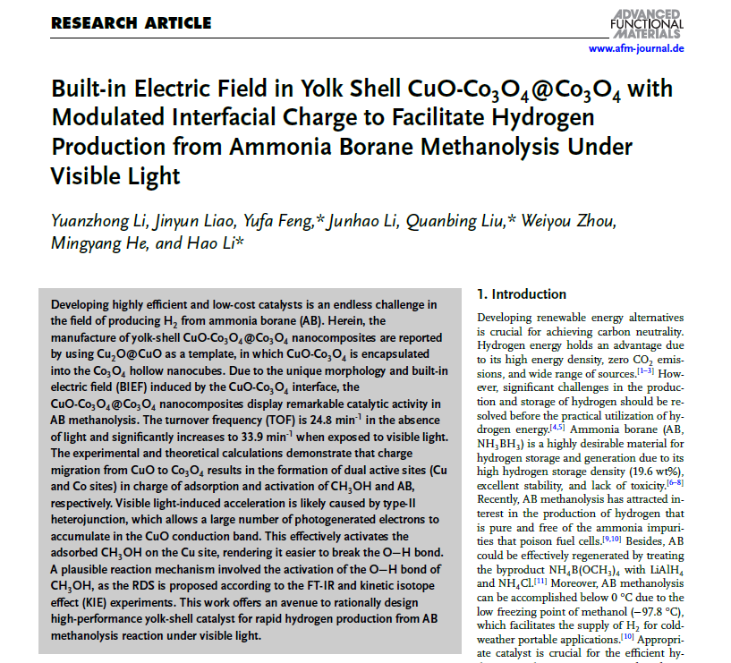 本网讯 近日,我校化学与材料工程学院李浩教授团队在氨硼烷制氢研究领域取得重要进展,相关成果发表在材料领域权威期刊《Advanced Functional Materials》(自然指数期刊、影响因子19),论文题目为“Built-in Electric Field in Yolk Shell CuO-Co3O4@Co3O4 with Modulated Interfacial Charge to Facilitate Hydrogen Production from Ammonia Borane Methanolysis Under Visible Light”。该论文由惠州学院和广东工业大学合作完成,第一单位为惠州学院,第一作者为联培硕士研究生李源钟,联合导师冯裕发博士、李浩教授为通讯作者。该研究工作得到了广东省普通高校创新团队项目(2023KCXTD035)、广东省高校重点领域专项(2023ZDZX3034)等项目支持。