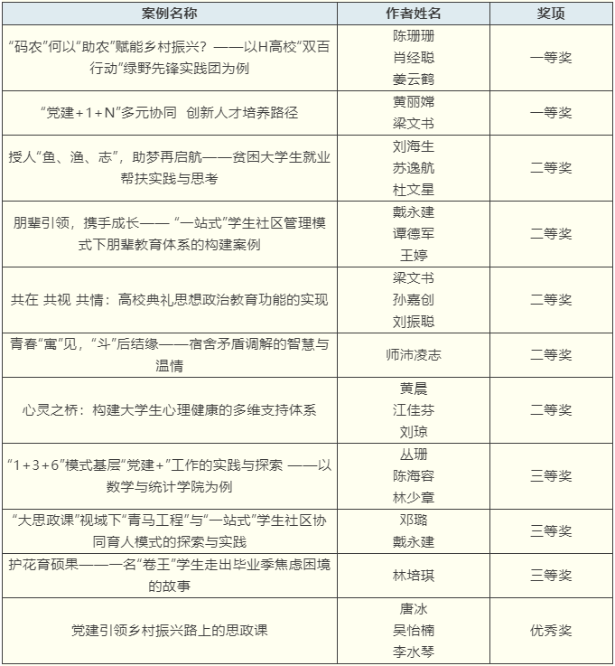 据悉,本次评选活动由为高校思想政治工作队伍培训研修中心(华南师范大学)和教育部高校辅导员培训和研修基地(华南师范大学)组织开展,旨在提升高校思想政治工作队伍素质能力,切实推动高校思想政治工作高质量发展。一直以来,学校高度重视辅导员队伍建设,将高校思想政治工作优秀论文、优秀案例、优秀网络课程征集和评选活动作为有效提升学生思想政治教育工作质量的重要举措,定期举办辅导员学习研讨会、搭建辅导员队伍职业化成长平台等方式提升辅导员队伍的素质能力。下一阶段,学校将继续坚持立德树人根本任务,深入贯彻落实全国高校思想政治工作会议精神,进一步加强辅导员队伍建设。通过完善培训体系、优化激励机制、搭建发展平台等举措,不断提升辅导员队伍的专业化、职业化水平,切实提高育人工作实效,为推进我校思想政治工作高质量发展提供坚实保障。