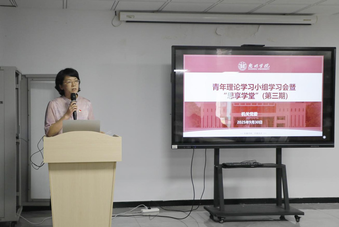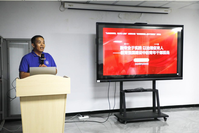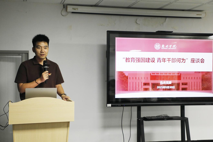 讲座后,会议进入交流座谈环节:党员干部代表陈智慧、杜建聪、马就武等围绕“教育强国建设 青年干部何为”主题,结合本职工作进行交流分享。陈智慧家庭荣获全国文明家庭称号,他以家庭视角切入,分享了家风传承与教育强国建设的紧密联系,强调以党员家庭的日常实践传递敬业与担当精神;杜建聪同志立足共青团工作实际,结合青年思想引领重点任务,分享了今年暑期带领校青马班学员赴井冈山开展实践研学的创新探索,他以井冈山实践研学为素材制作的“微团课”视频成功入选广东省委宣传部主办的“粤讲越精彩”栏目,并荣获2025年“立志·修身·博学·报国”主题教育系列活动一等奖。马就武结合社区辅导员和社会工作专业背景,分享了一站式学生社区建设中党建引领、网格治理与矛盾调解相结合的基层治理创新路径。