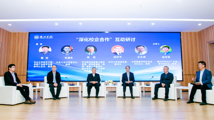 随后的互动研讨环节,杨勋先生与阎林平、张健东、王永进及戴欣展开深度对话。杨勋先生深情回顾了旭日集团与惠州学院四十年风雨同舟的合作之路。他表示,紧密的校企合作为产业发展奠定了坚实的人才基石,并持续推动了产业生态圈的繁荣与扩展。他坚信,产教融合是精准培养企业所需人才的有效途径,多年的实践已充分证明其巨大价值。