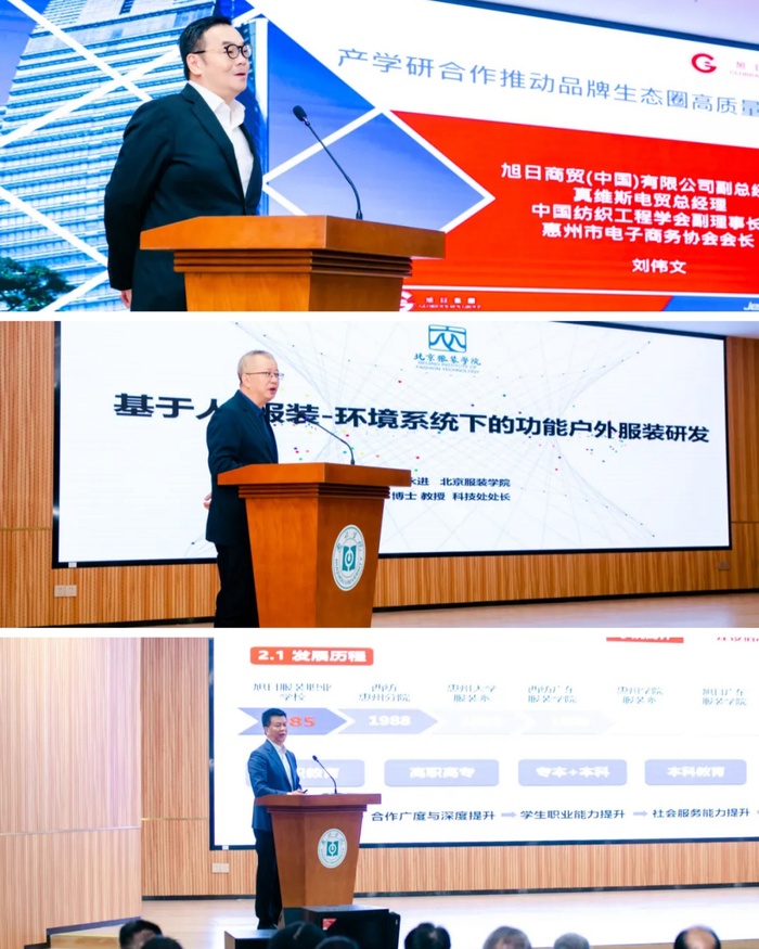 在主题演讲环节,刘伟文先生、王永进教授和旭日广东服装学院院长陈学军教授分别从产学研合作实践、功能户外服装研发、现代产业学院探索等维度分享了前沿观点。