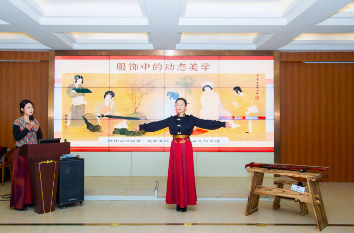 作为我校深耕美育教育、传承中华优秀传统文化的重要实践,本次活动以 “唐韵琴画・衣香茗心”为主题,由我校服装学院杨雪梅教授、岳欧璐博士联袂呈现,通过“观画、听琴、悟道”三大篇章,带领现场观众跨越千年时光,沉浸式感受唐代美学的独特魅力与当代价值,搭建起两校协同育人的文化桥梁。