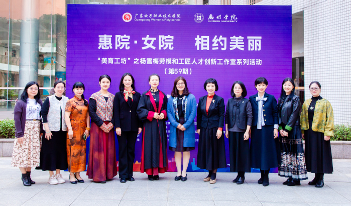 本网讯 12月16日下午,惠州学院杨雪梅劳模和工匠人才创新工作室“美育工坊”第59期活动在广东女子职业技术学院番禺校区茶艺实训室圆满举行。本次活动由惠州市侨联指导,惠州学院工会、宣传统战部、教务部与广东女子职业技术学院工会、组织宣传统战部联合主办,惠州学院侨联、服装学院党委共同承办。广东女子职业技术学院党委书记车小真、党委副书记何树莲,惠州学院服装学院党委书记张小琨、惠州城市职业学院相关部门负责人以及相关领导、教师、学生代表共计50余人参与活动。