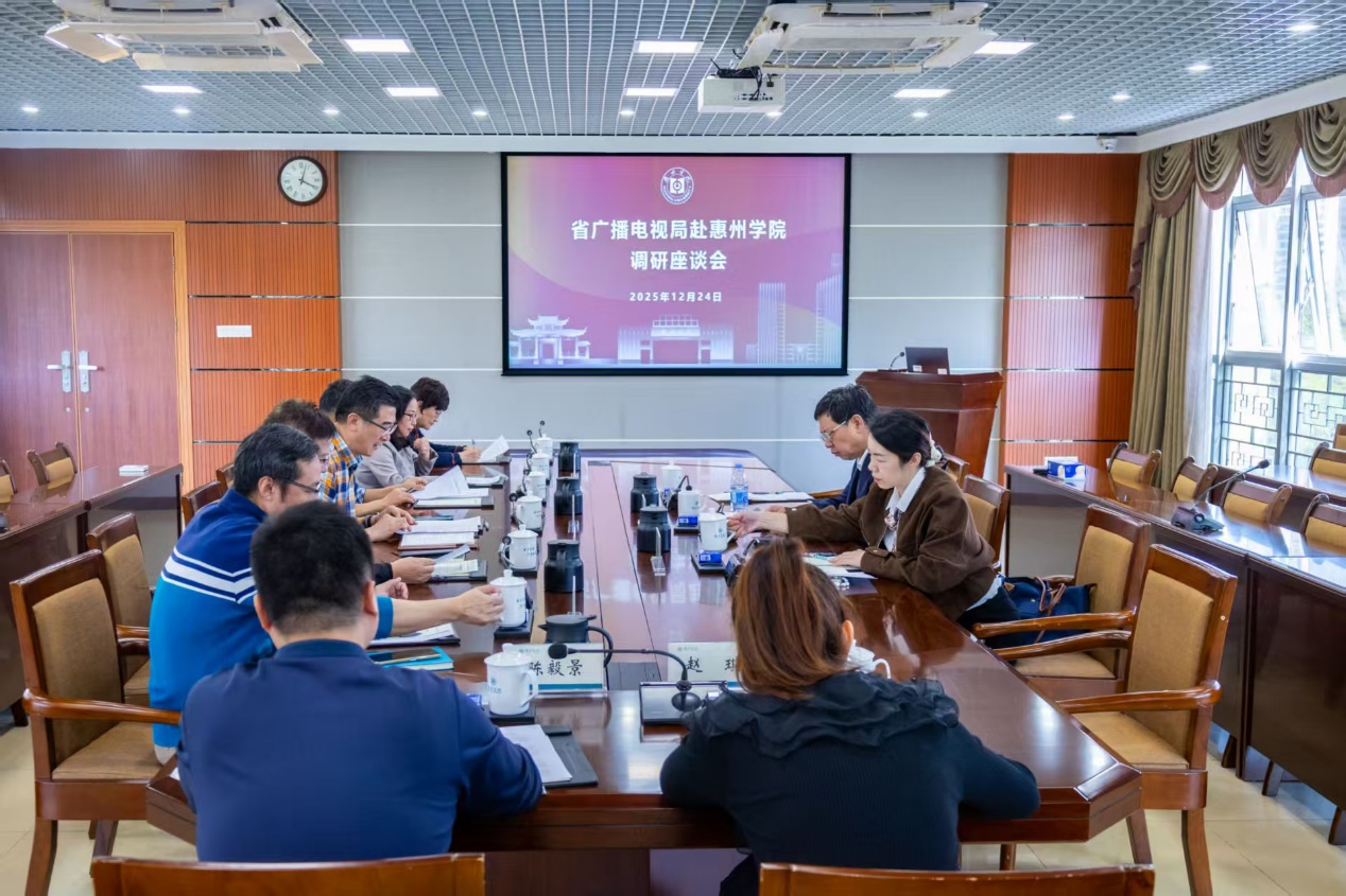 本网讯 12月24日下午,广东省广播电视局党组成员、副局长钟庆才率队莅临我校,专题调研未来视听产业学院建设工作。调研组一行包括省广播电视局网络视听节目管理处处长丁青青、三级主任科员曾依帆。调研座谈会由我校党委书记彭永宏主持,惠州市文化广电旅游体育局相关领导,我校教务部、文学与传媒学院相关负责人及网络与新媒体专业教师代表参加了座谈。