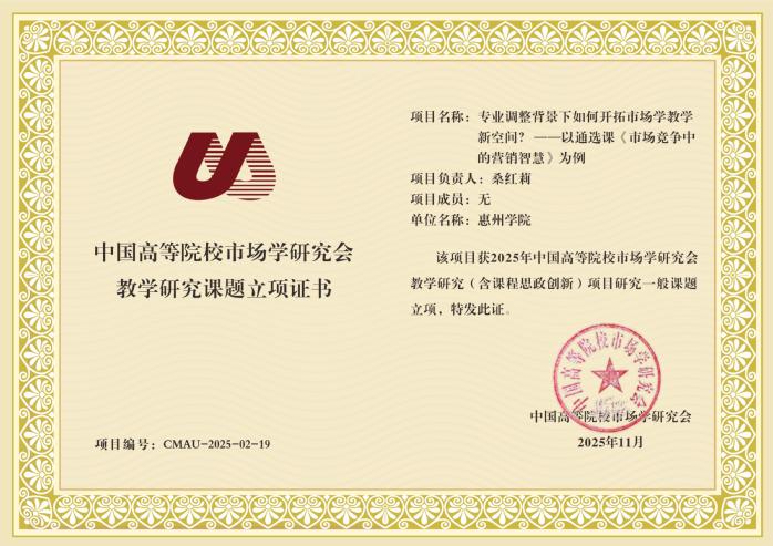 据悉,中国高等院校市场学研究会为国家一级学会,其教学研究成果评选具有较高专业性与权威性。本次年会共批准立项38项,我校两项成果成功突围、同步立项,不仅是对学校教学改革与创新能力的肯定,更是学校主动对接人工智能时代产业变革需求、深化“价值共生型”应用型人才培养模式的重要成果体现,进一步印证了学校“商科+技术+本土化”培养路径的科学性与前瞻性,为未来持续优化人才培养体系、服务区域新发展格局积累了宝贵经验、奠定了坚实基础。
