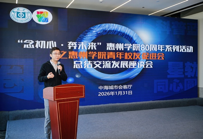 第一届青年校友促进会秘书长吴志鑫作《惠州学院青年校友促进会第一届理事会工作报告》,系统总结了青年校友促进会在完善章程、打造品牌、建立实践基地、推进文创项目等方面的工作成果。他表示,第一届理事会已完成从“0到1”的奠基,为青年校友工作开启了新篇章。