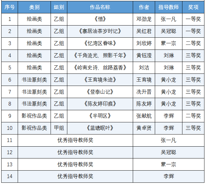 本网讯 近日,由广东省教育厅主办的第五届粤港澳大湾区大学生艺术节获奖名单正式揭晓。我校学子在本次艺术节中表现优异,共获14个奖项,其中一等奖2项、二等奖2项、三等奖6项,4位教师获“优秀指导教师奖”。