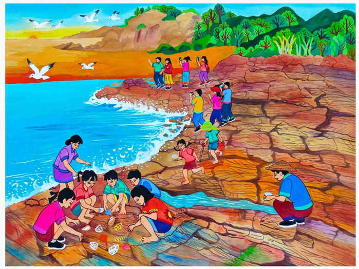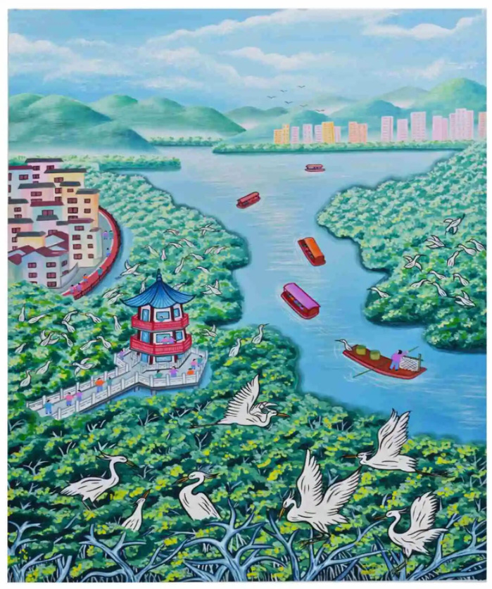 作为惠州向海图强的重要支点,稔平半岛的自然生态与建设风貌成为本次创作的焦点。展览作品聚焦红树林这一“海洋绿肺”,既展现其作为海洋生态屏障的自然魅力,也呼应了海洋强国战略下的绿色发展理念。画家们通过鲜明的色彩与质朴的笔触,记录下黄埠镇红树林区域的生态景观与人文活动,实现了传统艺术形式与现代生态主题的深度融合。
