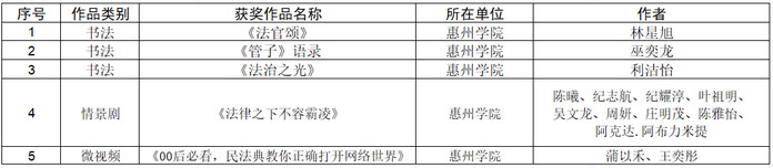 本网讯 近日,在惠州市法治文化作品征集评选活动中,我校师生紧扣法治主题、立足青年视角创作的5件法治文化作品脱颖而出,成功获奖,获奖作品涵盖微视频、书法、情景剧三大类别,充分展现学校法治文化育人与文艺创作的丰硕成果。
