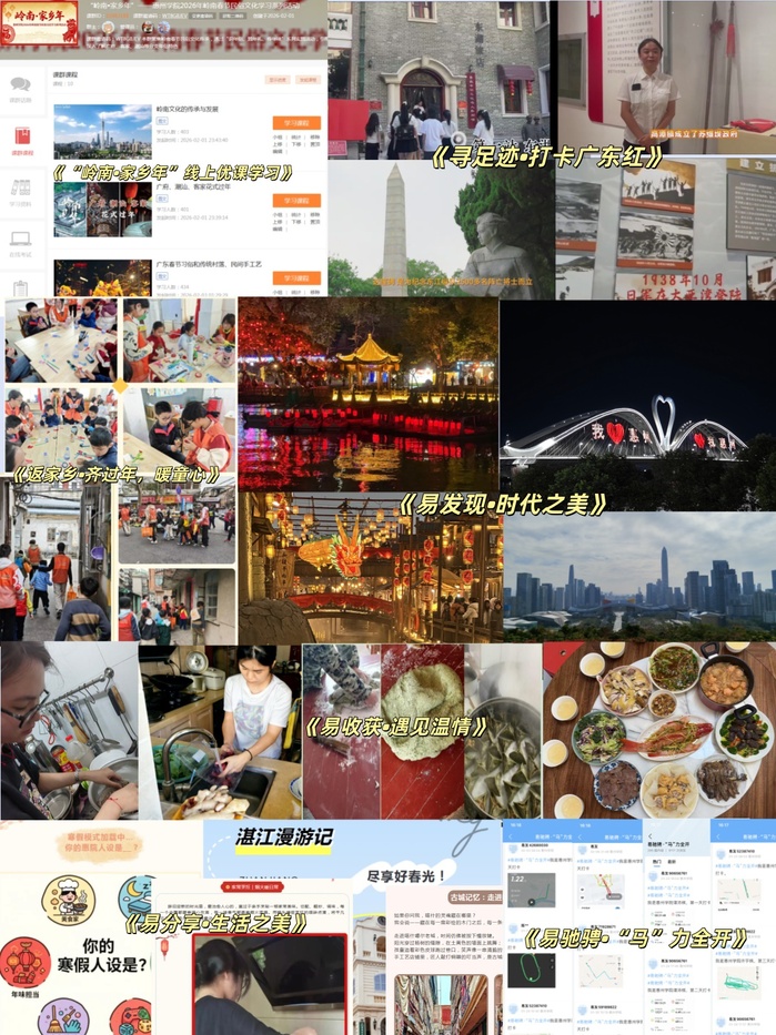 本次活动坚持“线上赋能、线下实践、家校协同、全域覆盖”,构建起全方位育人体系:一是打造线上精品优课,让文化学习入脑入心。依托易班平台开设“岭南•家乡年”专题优课,上线岭南文化传承、春节习俗、传统村落、民间手工艺、英歌舞、粤西年例等优质视频与课程资料,配套开展知识测试、话题互动、作业展示,推动岭南年俗文化可看、可学、可悟。二是开展“‘易’马当先•‘惠’启新程”主题实践,让五育并举落地见效。紧扣“五育并举”理念,融合家国情怀、传统文化与青春实践,设置立心铸魂、启智润心、健体强魄、尚美塑心、笃行实干五大篇章,推出短视频征集、榜样诵读、数字非遗创作、运动打卡、主题摄影、推文展示、寒假劳育等七大子活动,打造有年味、有温度、有活力的实践育人平台。三是组织“返家乡•齐过年,暖童心”志愿服务,让青春担当闪亮基层。广大青年学生返乡进社区、入校园,开展科普义教、非遗创作、年俗体验等志愿服务,以实际行动传递温暖、服务社会,展现新时代大学生的责任与风采。通过系列活动,同学们进一步深化对岭南传统节日文化与民俗内涵的理解,深刻认识春节民俗在赓续中华文脉、厚植家国情怀、增强文化自信中的重要作用,以青春行动践行传承中华优秀传统文化的时代使命。
